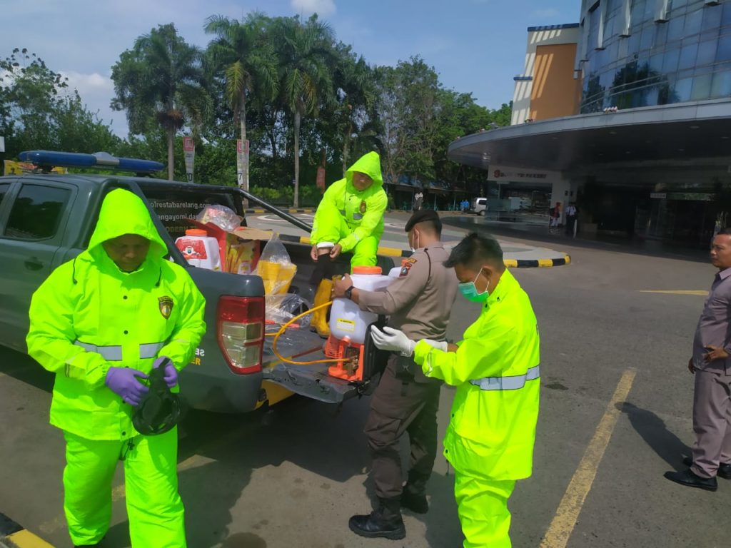 Sebanyak 15 personil Satuan Sabhara Polresta Barelang melakukan penyembprotan dan bersih-bersih di Panbil Mall, Muka Kuning, Batam, Kamis (19/3/2020). (photo:probatam/iin)