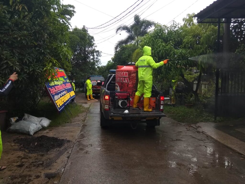 Dalam kegiatan ini dilakukan juga penyemprotan disinfektan di sekitar lingkungan perumahan Baitul Hasannah.