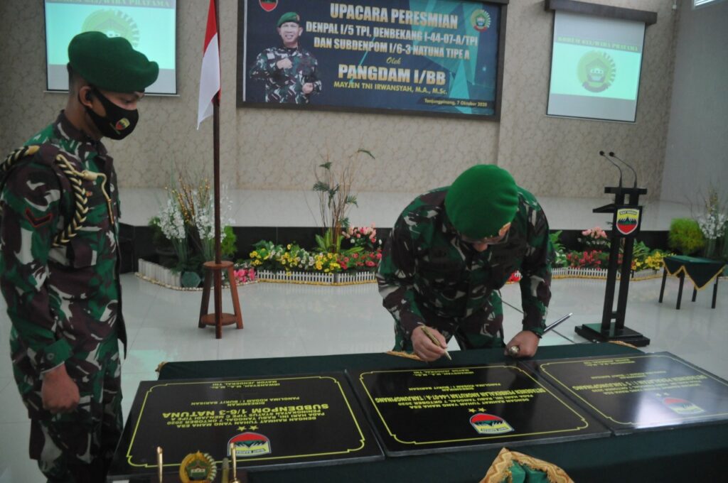 “Sehubungan dengan ini maka pada hari ini, Rabu, 7 Oktober 2020. Pangdam I/BB telah meresmikan pengunaan satuan baru Denpal I/5 Tanjungpinang, Denbekang I-44-07-A/Tanjungpinang Korem 033/WP dan peningkatan status Subdenpom I/6-3 Natuna dari Tipe C menjadi tipe A di GSG Korem 033/WP di Jln Sei Timun Km 14 Kota Tanjungpinang,” kata Kapenrem 033/Wira Pratama, di Tanjungpinang, Rabu (7/10/2020)