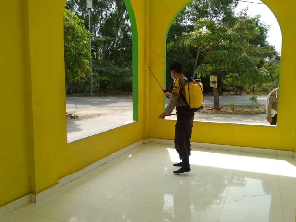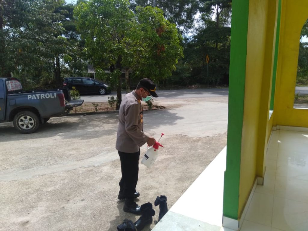 PROBATAM.CO, Batam – Kapolsek Galang AKP Herman Kelly bersama personil Polsek Galang, kembali melakukan penyemprotan cairan disinfektan di wilayah hukum Polsek Galang.