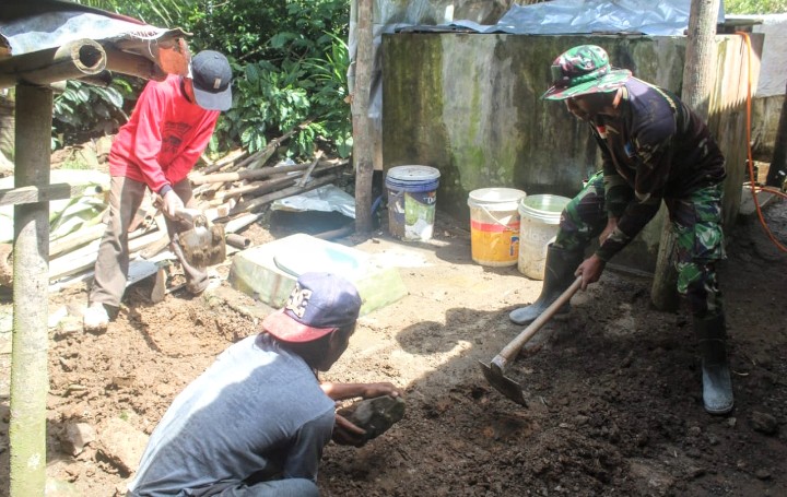 Di tengah ibadah puasa, para prajurit bersama warga Desa Somagede tetap bergotong royong menyelesaikan pembangunan Mandi, Cuci, Kakus (MCK) milik Bapak Darjo, Senin 2 Maret 2026.