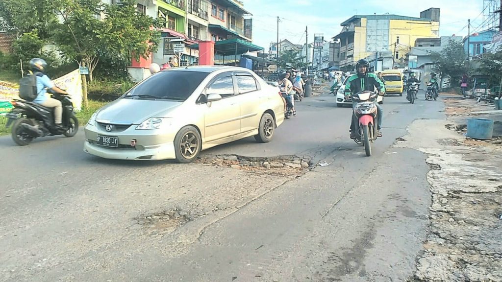 Pantauan di lapangan, Kamis (20/6/2019) pagi, posisi jalan yang berlubang itu dipadati kendaraan yang melintas. Pengendara terlihat kesulitan menghidari jalan berlubang tersebut karena lebar lubangnya hampir 2 meter.