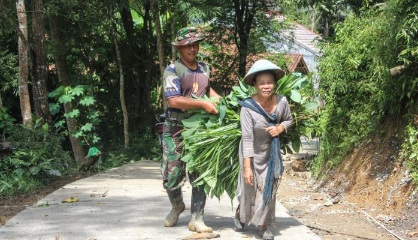 Melihat itu, seorang prajurit menghentikan sejenak pekerjaannya. Dengan sigap ia membantu merapikan bawaan sang ibu, sembari mengingatkan agar berhati-hati melewati jalur yang masih licin oleh adukan semen.