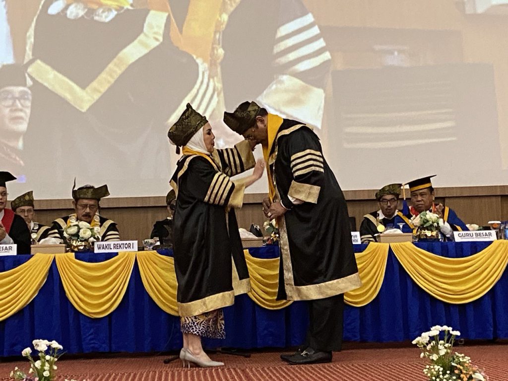 Selanjutnya Soerya Respationo mendapatkan pengalungan sumir atau kalung wisuda dengan meraih gelar karir akademik tertinggi, sebagai seorang dosen dan akademisi.