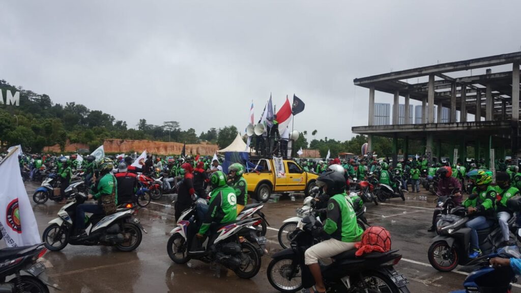Sebelum demo, ratusan driver Gojek tersebut itu berkumpul dulu di lapangan Welcome To Batam (WTB) Batam Center.