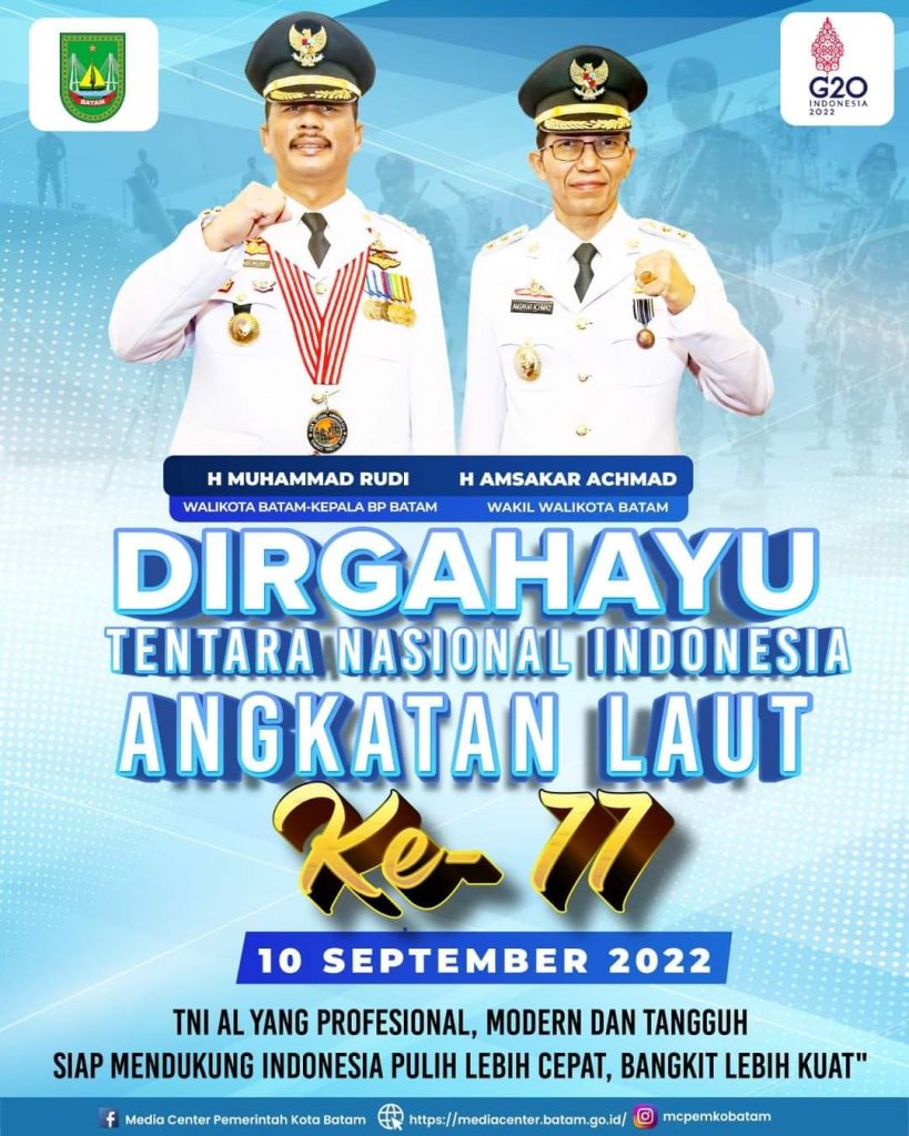PROBATAM.CO, Batam – Tentara Nasional Indonesia Angkatan Laut (TNI AL) pada tanggal 10 September 2022 berusia 77 tahun. Atas nama Pemerintah Kota (Pemko) Batam, Wali Kota Batam Muhammad Rudi dan Wakil Wali Kota Batam Amsakar Achmad mengucapkan selamat kepada jajaran TNI AL.