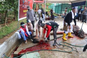 Proses penyembelihan hewan kurban oleh panitia di Mapolresta Barelang, Jumat (31/7/2020). (Photo: hms)