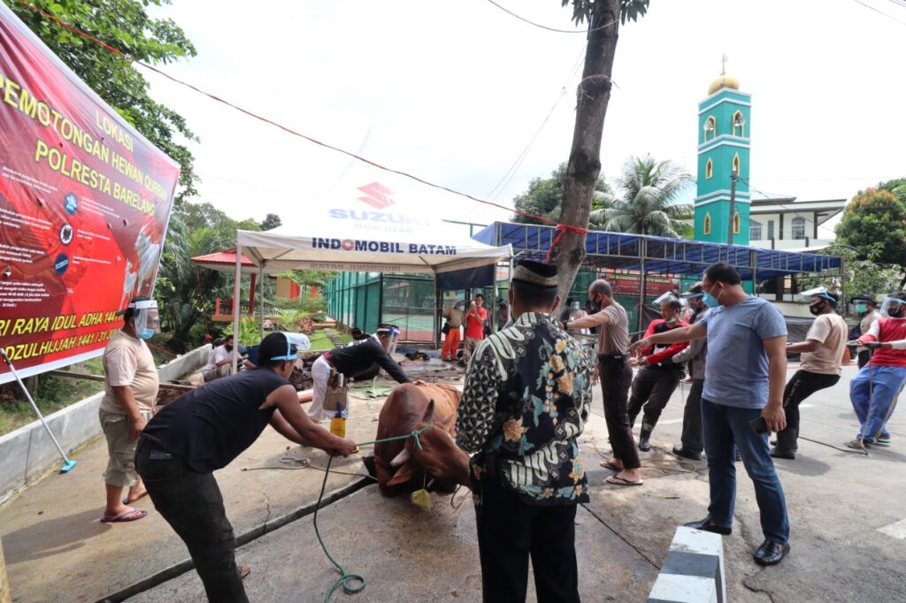 PROBATAM.CO, Batam -Merayakan hari raya Idul Adha 10 Zulhijjah 1441 H, yang bertepatan dengan Jum’at 31 Juli 2020, Polresta Barelang melaksanakan penyembelihan 22 ekor hewan kurban, terdiri dari 6 ekor sapi dan 16 ekor kambing.