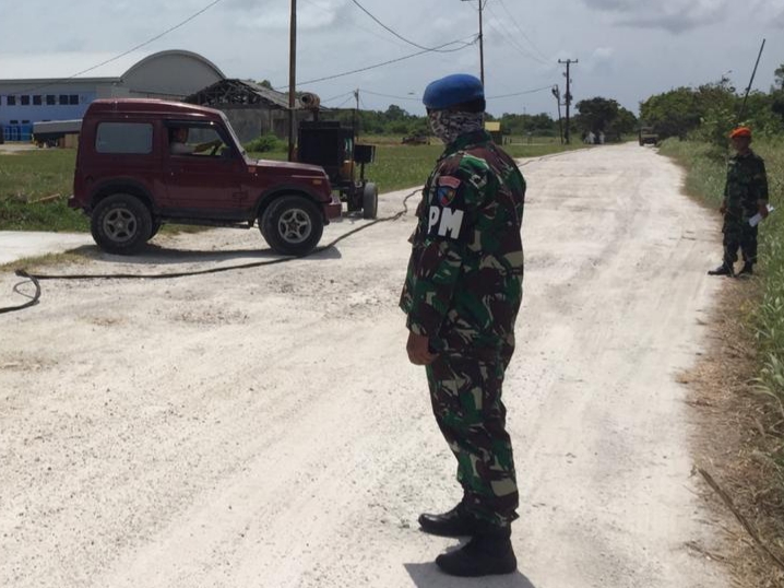 Aparat TNI berjaga-jaga menjaga arus jalan saat kunjungan Menhan Prabowo Subianto ke Natuna, Rabu (5/2/2020). (photo: probatam/hai)