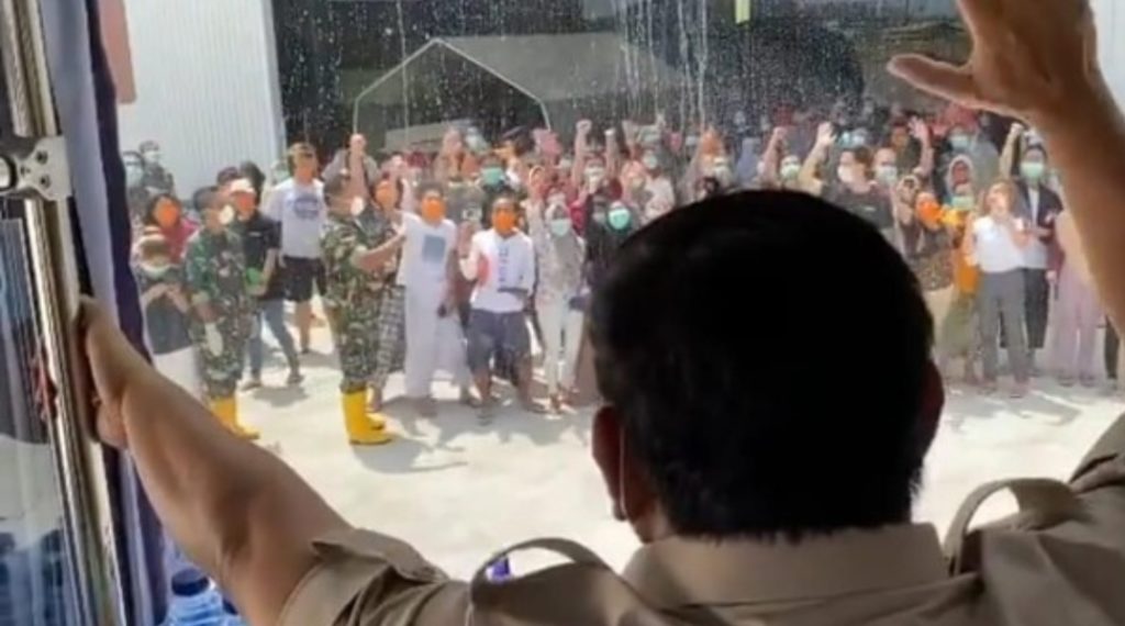 Ratusan WNI dari Wuhan yang sedang observasi di Natuna sambut riang lambaian tangan Menhan Prabowo Subianto, beberapa waktu lalu. (photo: probatam/hai)