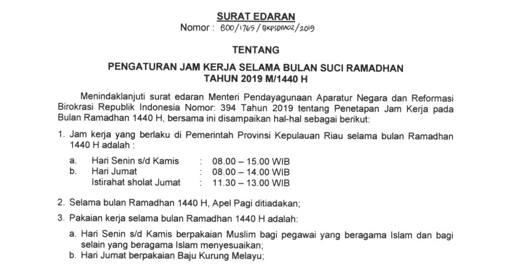 Aturan itu ditegaskan melalui surat edaran Sekretaris Daerah Pemerintah Provinsi Kepri nomor 800/1765/BKPSDM02/2019 tentang peraturan jam kerja ASN selama Ramadhan.