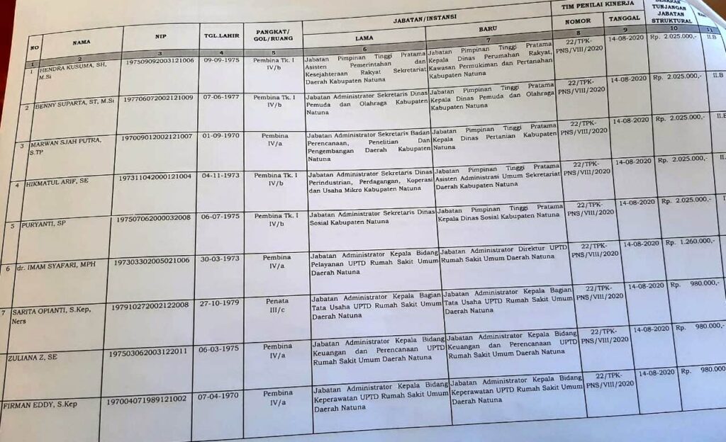 Probatam,Natuna– Sebanyak 26 orang PNS dilantik oleh Bupati Natuna Drs H A. Hamid Rizal menduduki jabatan baru, terdiri dari posisi jabatan tinggi pertama sebanyak 5 orang, posisi jabatan administrator 6 orang, posisi jabatan pengawas 13 orang, dan posisi jabatan fungsional 2 orang.