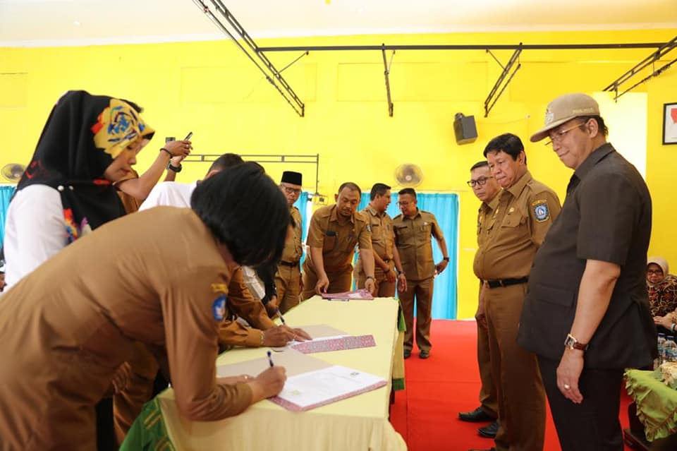 PROBATAM. CO, Karimun – Plt Gubernur Provinsi Kepulauan Riau (Kepri) H.Isdianto di dampingi sang istri Hj.Rosmeri, Bupati dan Wakil Karimun H. Aunur Rafiq dan H. Anwar Hasim menyaksikan Penandatanganan Kontrak Kerja dan Pakta Integritas Anti Narkoba Guru Tidak Tetap (GTT) di SMKN 1 Tanjung Balai Karimun dan SMAN 1 Tanjung Batu, Kundur, Selasa (28/1/2020).