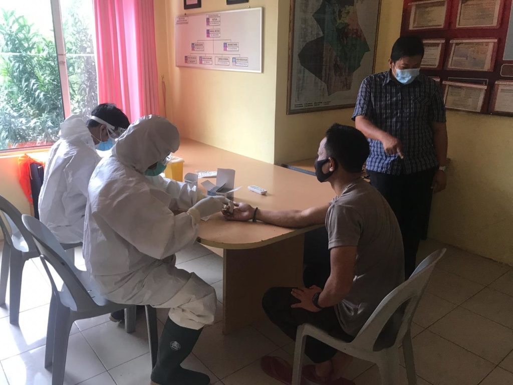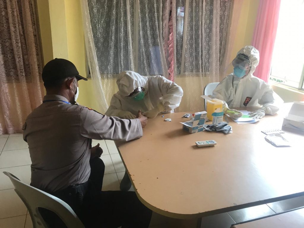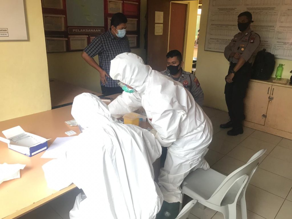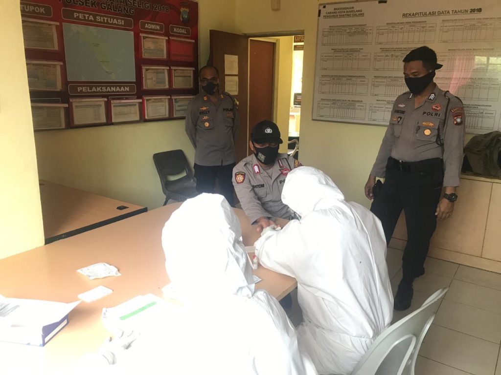 Kapolsek Galang AKP Herman Kelly, bersama 16 personil Polsek Galang dan 4 orang PHL mengikuti pemeriksaan Rapid Test oleh petugas medis Unit Pelayanan Teknis (UPT) Puskesmas Galang, Dokter Redo dan petugas Laboratorium, Risky, di Mapolsek Galang, dan hasilnya “Non Reaktif”.