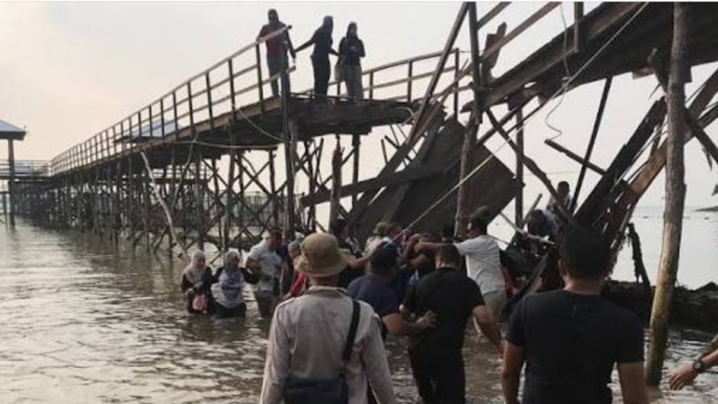 “Saat itu ada rombongan WNA dari Singapura. Sebanyak 60 WNA saat itu sedang berswa foto di jembatan. Namun jembatan yang kaki-kakinya terbuat dari kayu itu diduga lapuk dan menyebabkan jembatan roboh,” kata Erlangga, malam tadi.