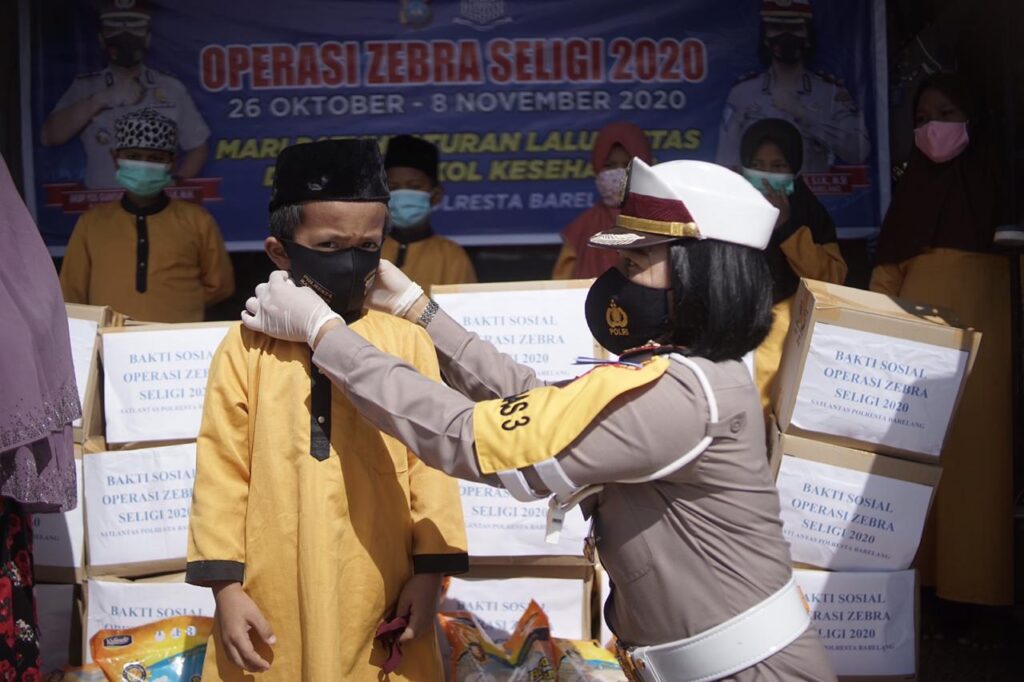 Kasat Lantas Polresta Barelang Kompol Yunita Stevani, S.IK, membagi dan memasangkan masker ke anak panti asuhan di Batam Center,Batam, Jumat (30/10/2020) (photo: hms)