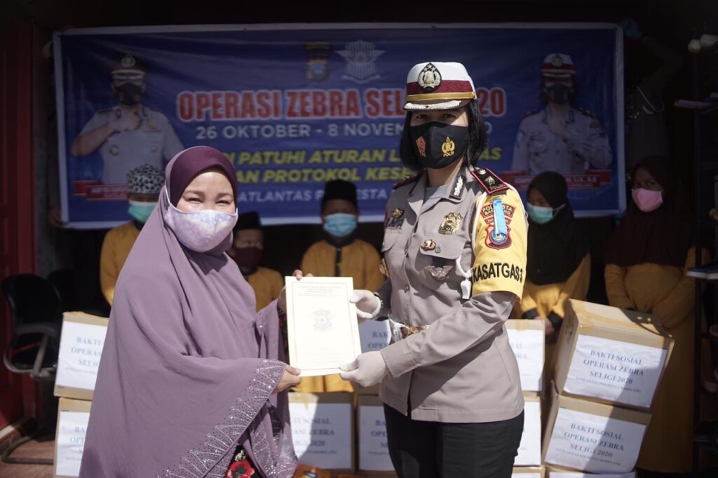 Kasat Lantas Polresta Barelang Kompol Yunita Stevani, S.IK, menyerahkan bantuan ke salah satu panti asuhan di Batam Center, Batam, Jumat (30/10/2020) (photo: hms)