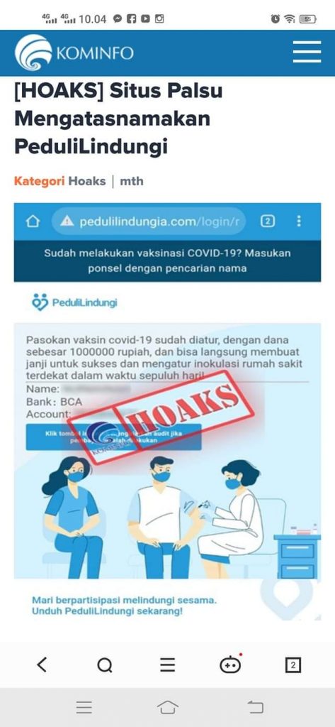 “Sudah ada pernyataan dari Kemkominfo bahwa situs http://pedulilindungia.com adalah situs palsu dan bukan situs yang digunakan oleh Pemerintah untuk melakukan penanganan Covid-19. Seluruh isi dan informasi dalam situs pedulilindungia.com tidak terkait dengan situs PeduliLindungi.id dan tidak berhubungan dengan upaya Pemerintah melakukan penanganan Covid-19 dalam bentuk apapun,” kata Azril, Jumat (10/9/2021).