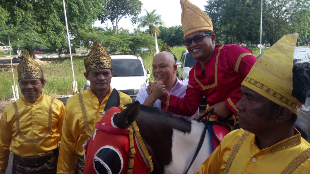 PROBATAM.CO, Batam – Dengan setelan khas adat Minangkabau, Yuhendri menunggangi kuda datang ke kantor DPC Gerindra Batam mengembalikan formulir pendaftaran calon Wali Kota, Senin (18/11) sore.