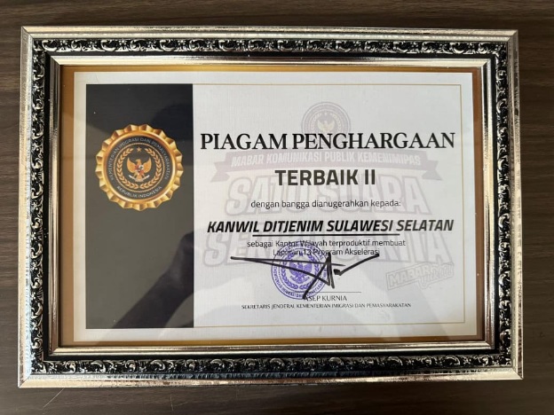 Kanwil Sulsel meraih posisi Terbaik Kedua, bersanding dengan Kanwil Ditjen Imigrasi Bali sebagai Terbaik Pertama dan Kanwil Ditjen Imigrasi DIY sebagai Terbaik Ketiga.