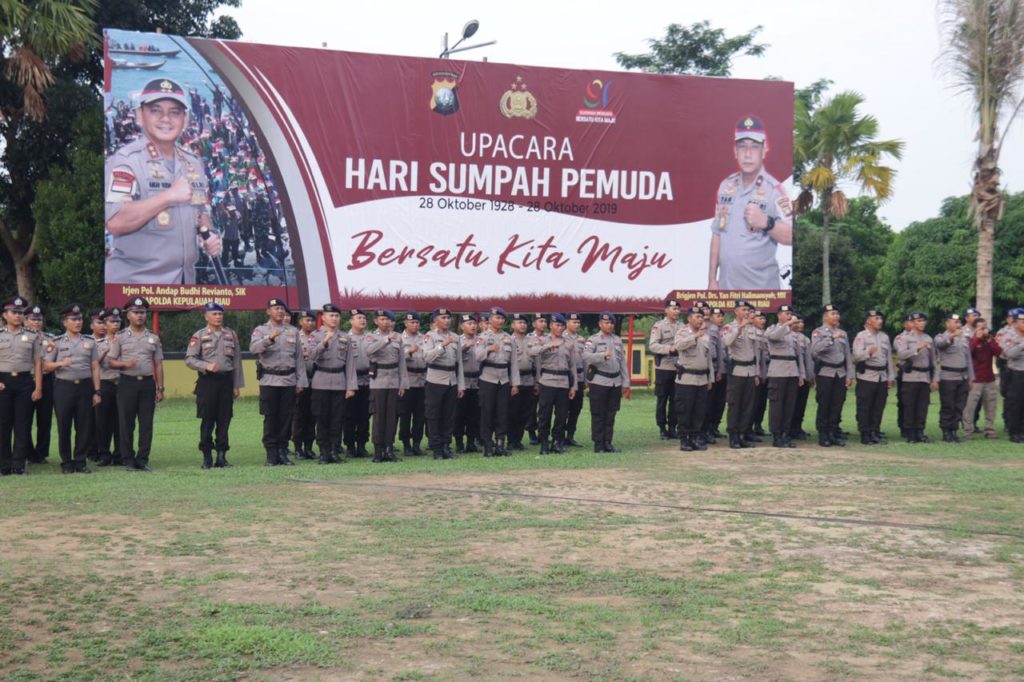 Dari atas podium, Kapolda Kepri juga membacakan Amanat Menteri Pemuda dan Olahraga Republik Indonesia Dr. H. Zainudin Amali, Hari Sumpah Pemuda ke-91 kali ini mengambil tema Bersatu Kita Maju.