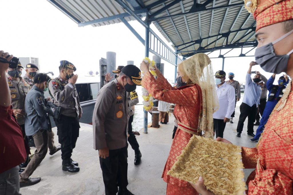 Kapolda Kepri beserta rombongan tiba di Pelabuhan Domestik Tanjungbalai Karimun langsung disambut dengan pengalungan bunga sebagai bentuk penyambutan terhadap tamu yang datang.
