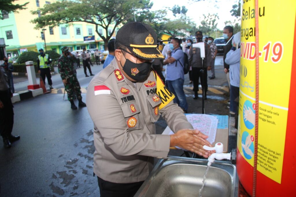Kapolresta Barelang AKBP Yos Guntur YFS, sedang mencuci tangan di kawasan Batamindo, Muka Kuning, kota Batam. (Photo: hms)