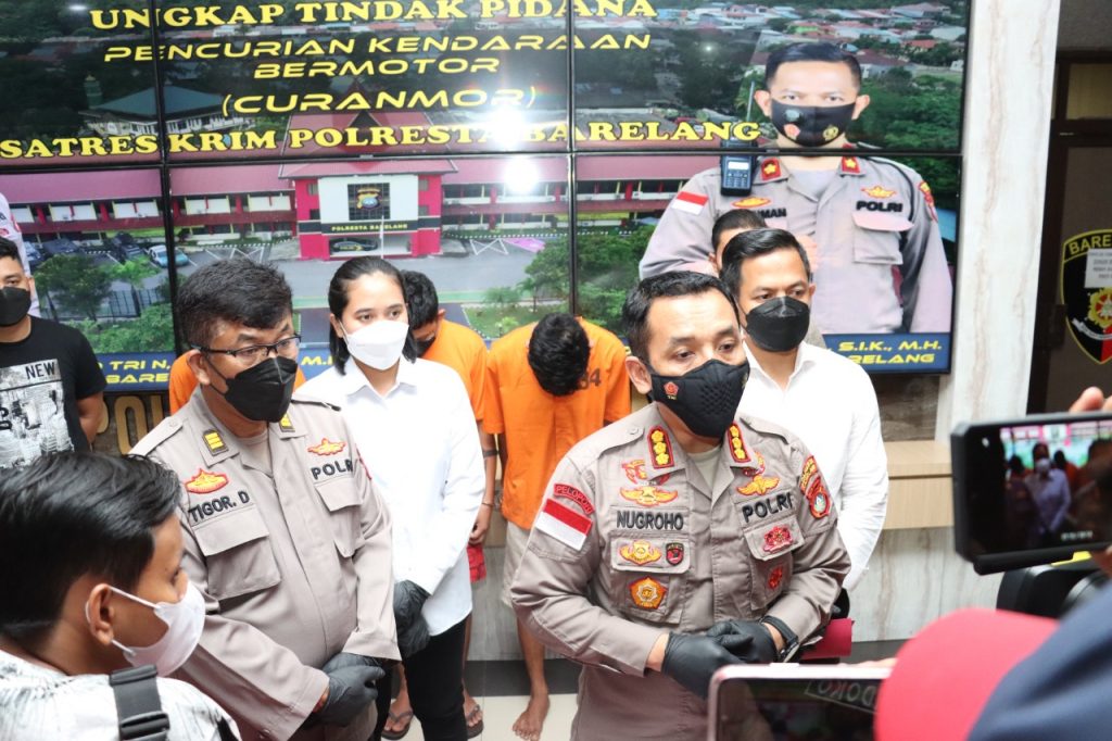 PROBATAM.CO, Batam– Kapolresta Barelang Kombes Pol Nugroho Tri Nuryanto, SH, SIK, MH menggelar Konferensi Pers Ungkap Kasus Tindak Pidana Curanmor yang di dampingi oleh Kasat Reskrim Polresta Barelang Kompol Abdul Rahman, SH, S.I.K. M.H, Kasi Humas AKP Tigor Sidabariba, SH, serta Kanit PPA Iptu Dwi Dea Anggraini STrk, di Lobby Mapolresta Barelang, Senin (25/4/2022)