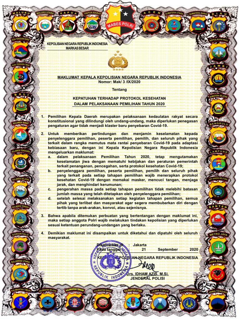 Menyikapi hal tersebut Kapolri Jenderal Polisi Drs. Idham Azis, M.Si mengeluarkan Maklumat Kapolri tentang Kepatuhan Terhadap Protokol Kesehatan Dalam Pelaksanaan Pemilihan Tahun 2020, Senin (21/9/2020).