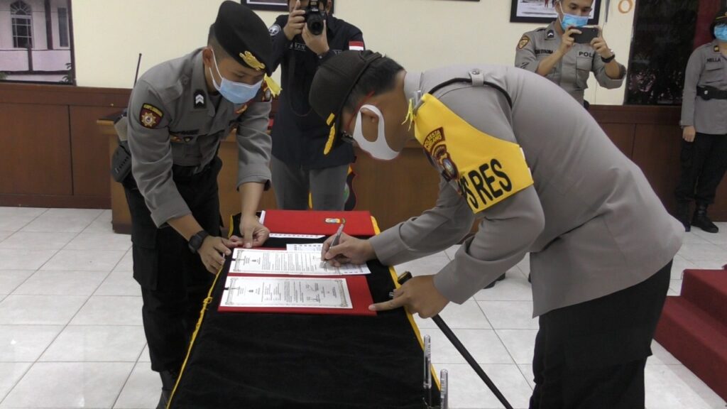 PROBATAM, CO, Batam- Kepala Kepolisian Resort Kota Barelang AKBP Purwadi Wahyu Anggoro, S.I.K, M.H. memimpin acara serah terima jabatan Kapolsek Batu Aji dan Kapolsek Batu Ampar, hari ini, Rabu (24/6/2020),di Aula Anindita Lantai 2 Polresta Barelang.