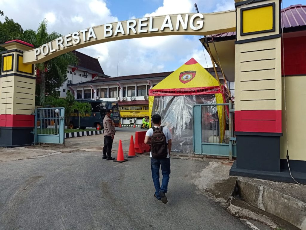 Setiap masyarakat atau personil kepolisian yang mau ke Mapolresta Barelang diharuskan melewati tenda khusus untuk dilakukan penyemprotan desifektan di pintu gerbang. (photo:probatam/iin)