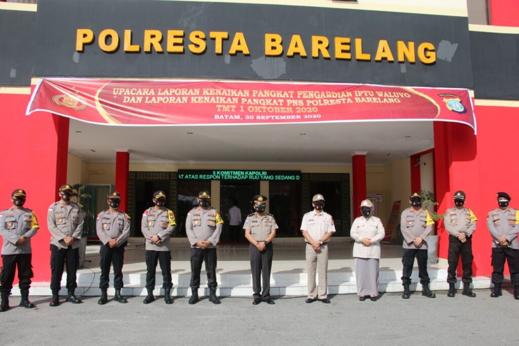 PROBATAM.CO, Batam- Kapolresta Barelang Polda Kepri AKBP Yos Guntur Y.F.S , SH, S.IK, MH, memimpin langsung Upacara Korp Raport Kenaikan Pangkat Pengabdian Setingkat Lebih Tinggi dari Inspektur Polisi Dua (Ipda) menjadi Inspektur Polisi Satu (Iptu) kepada PS. Kanitbintibmas Satbinmas Polresta Barelang Polda Kepri Iptu Waluyo di Lapangan Apel Polresta Barelang, Rabu (30/9/2020)