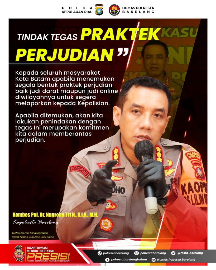 Kapolresta Barelang mengimbau kepada masyarakat Kota Batam supaya tidak segan-segan dalam memberikan informasi kepada kepolisian dan benar adanya praktek perjudian baik itu judi darat maupun judi online akan segera ditindak sesuai dengan ketentuan hukum yang berlaku.