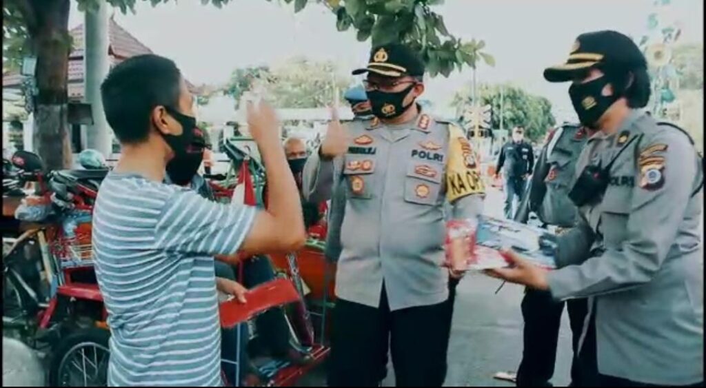 PROBATAM.CO, YOGYAKARTA-Kapolresta Yogyakarta Kombes Pol Purwadi W Anggoro, S.IK, MH turun langsung bersama anggota membagikan masker dan memberikan himbauan kepada masyarakat dan pengunjung di kawasan Malioboro, Kota Yogyakarta, Provinsi DIY.
