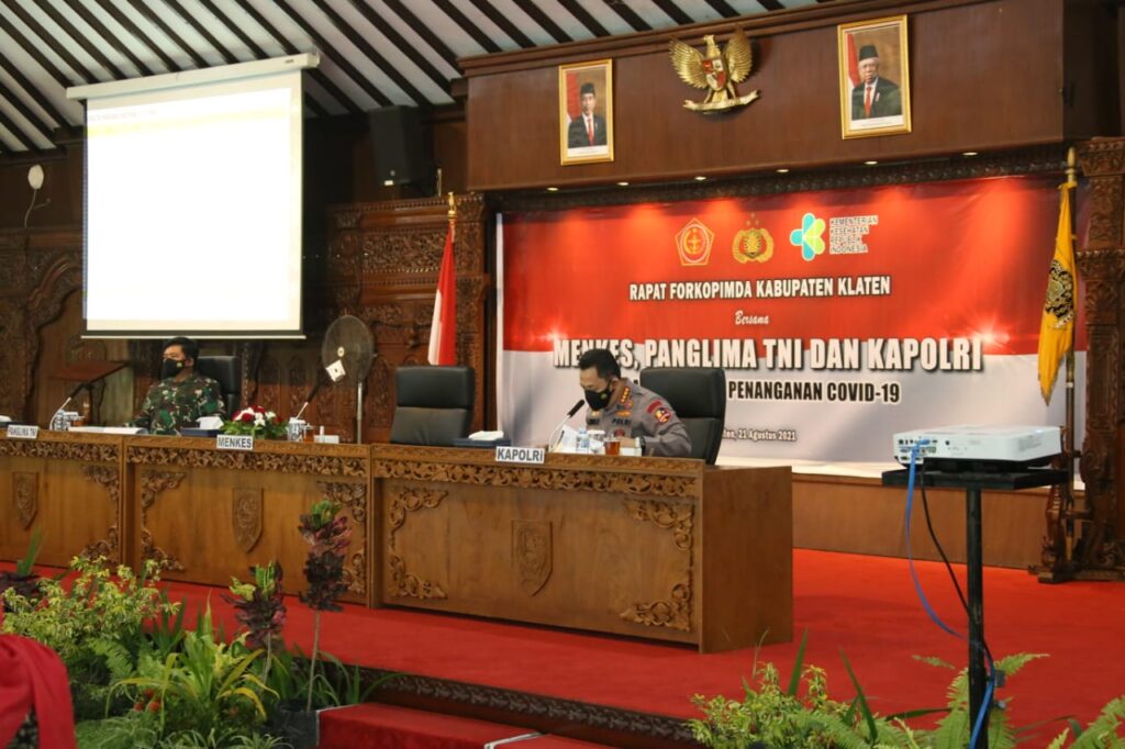 PROBATAM.CO, Jakarta – Panglima TNI Marsekal Hadi Tjahjanto dan Kapolri Jenderal Listyo Sigit memimpin rapat pengarahan penanganan dan pengendalian Covid-19 bersama Forkopimda Klaten, Jawa Tengah (Jateng), Sabtu (21/8/2021).
