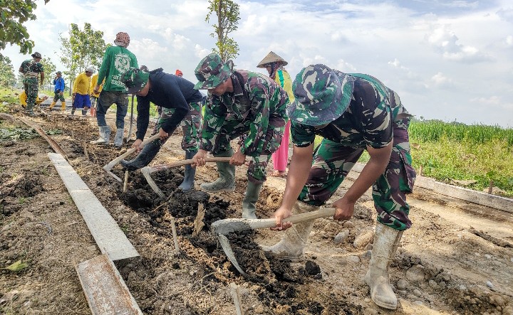 Sertu Sunardi memimpin langsung anggota Satgas TMMD Reguler ke-128 Kodim 0725/Sragen dalam proses perataan tanah jalan yang akan segera dicor.
