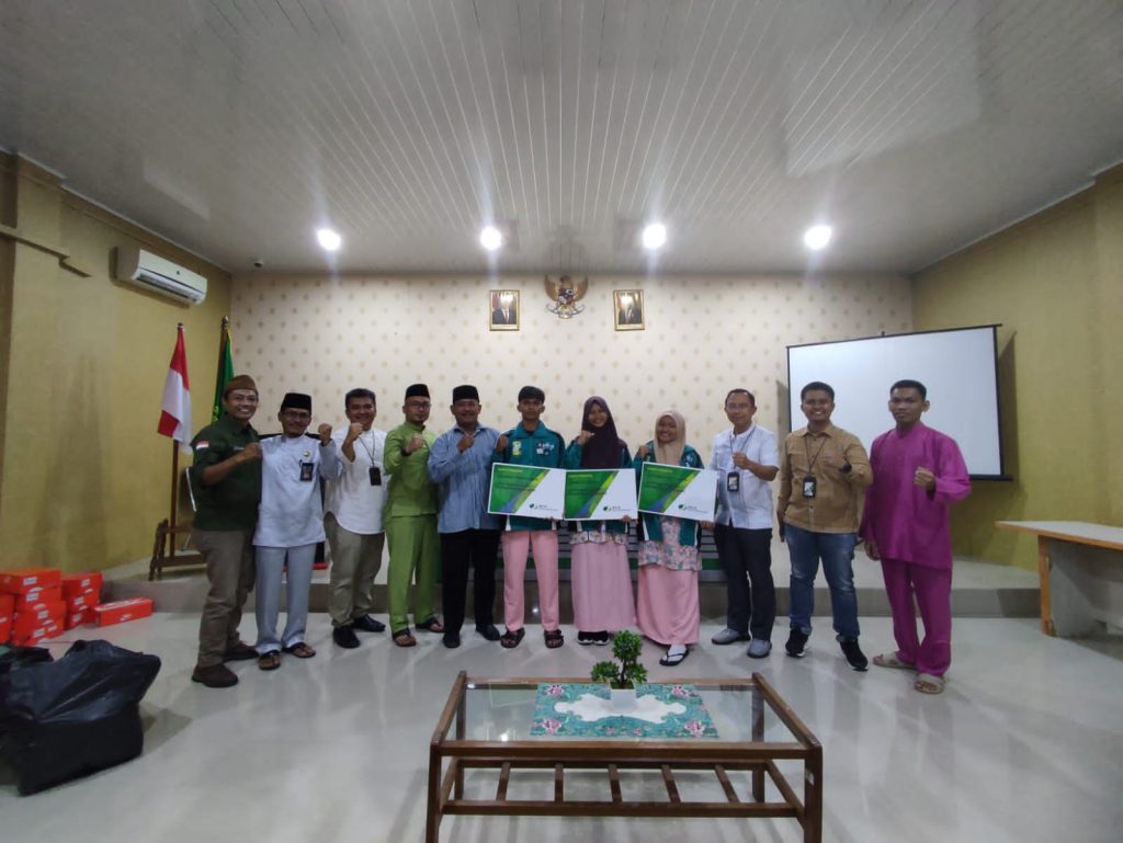 Penyerahan Simbolis Kartu Peserta BPJS Ketenagakerjaan dilakukan langsung oleh Kepala BPJS Ketenagakerjaan Batam Sekupang, Seto Tjahjono didampingi Panitia Kontingen yang juga Kepala Sekai Madrasah Kemenag Batam, Andika Setiawan di sela-sela acara pembekalan dan persiapan serta pelepasan 41 orang kontingen asal Provinsi Kepulauan Riau, di aula Fauzi Mahbub, Kantor Kementerian Agama (Kemenag) Kota Batam, Jumat (13/01/2023).