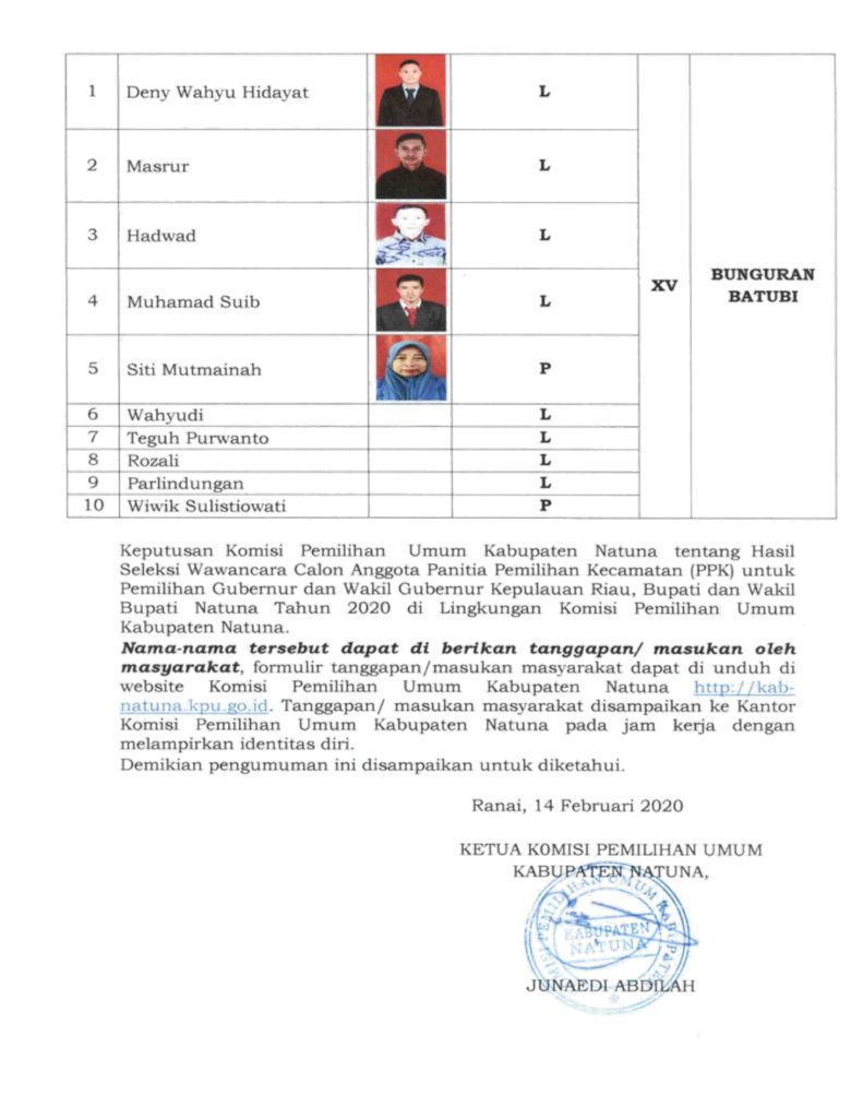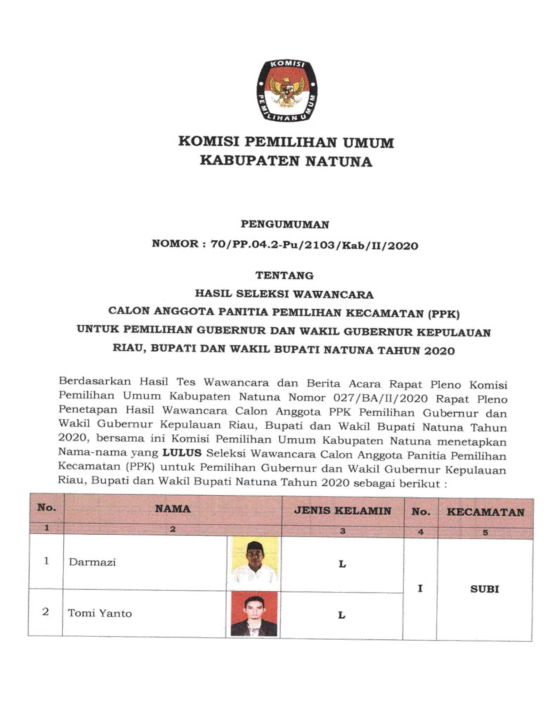 Berdasarkan hasil tes wawancara dan berita acara rapat pleno KPU kabupaten Natuna Nomor 027/BA/II/2020,  menetapkan hasil wawancara calon anggota PPK pemilihan Gubernur dan Wakil Gubernur Kepulauan Riau, Bupati dan Wakil Bupati Natuna  tahun 2020 bersama ini KPU Kabupaten Natuna menetapkan nama-nama yang lulus seleksi wawancara calon anggota PPK di lingkungan KPU kabupaten Natuna.