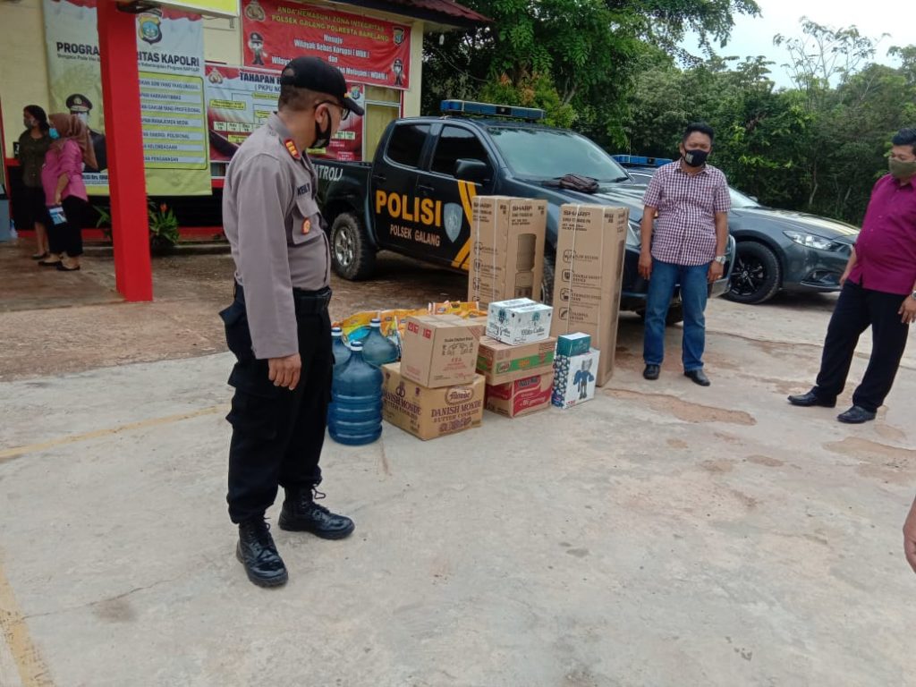 Kapolsek Galang AKP Herman Kelly menerima sembako, vitamin dan masker bantuan dari Kapolresta Barelang yang diserahkan Wakapolresta. (Photo:probatam/iin).
