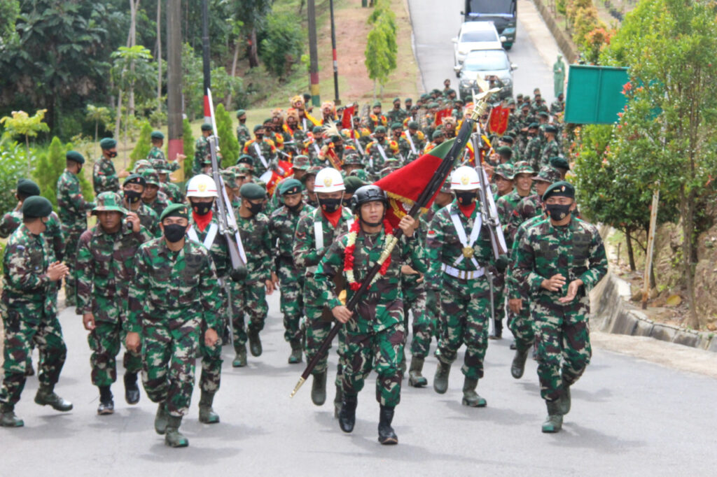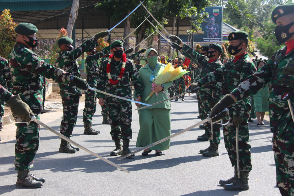 Rangkaian penyambutan Danyonif Raider Khusus 136/TS Disambut oleh Komandan Lama dengan Pengalungan Bunga dan dilanjutkan dengan acara Arak-arakan Sepanjang Jalan Utama Mako Yonif Raider Khusus 136/TS.