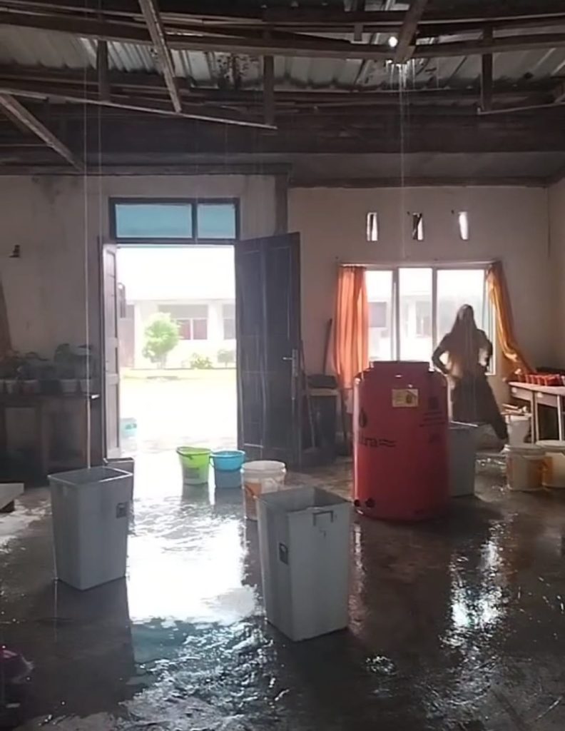 Ketika hujan turun, air menetes dari langit-langit ke meja guru dan lantai.