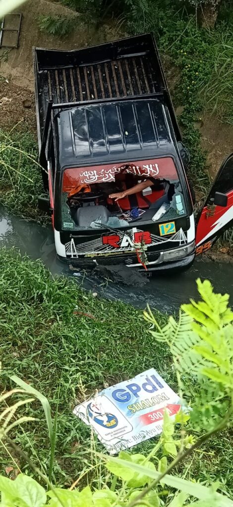 Namun belum dipastikan apa yang menyebabkan mobil pick up tersebut terjun ke dalam parit, diduga sebelum terjatuh mobil pick up tersebut bertabrakan dengan mobil box warna kuning.