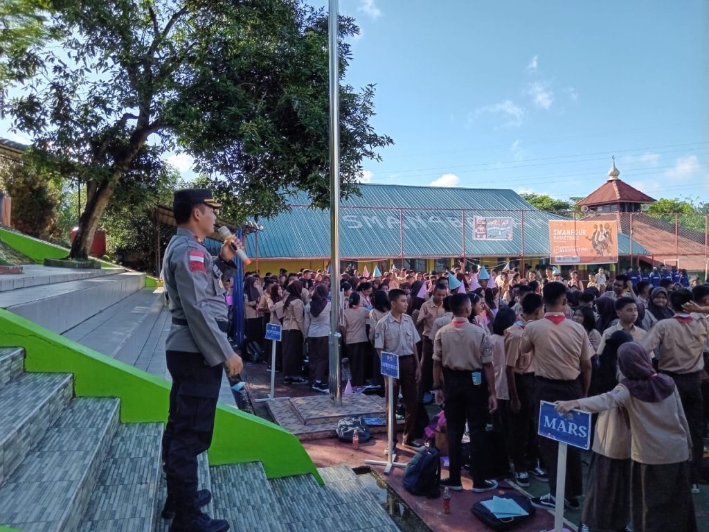 Terlihat di sekolah SMA Negeri 4 Kota Batam Kapolsek Sekupang menjadi narasumber dalam kegiatan MPLS (Masa Pengenalan Lingkungan Sekolah) siswa baru di SMA Negeri 4 Tiban Lama, Kecamatan Sekupang, Kota Batam, Rabu (12/07/2023)