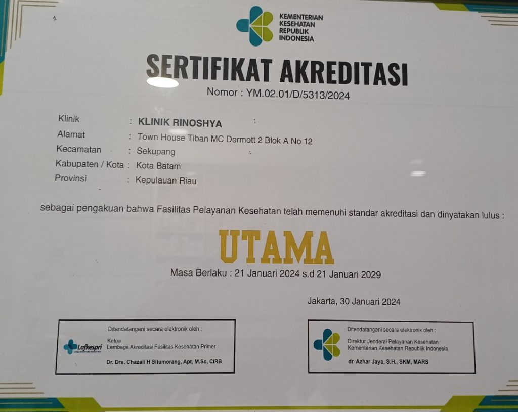 Sertifikasi Akreditasi Klinik Rinoshya. (Foto: probatam.co/ind)
