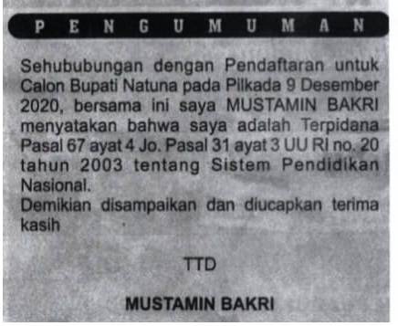 Untuk memenuhi ketentuan yang disyaratkan KPUD Natuna sebagai Bacalonkada yang pernah menjadi terpidana, Mustamin sudah mengumumkan status masalalunya ke publik melaui media cetak utama terbitan Kepri.