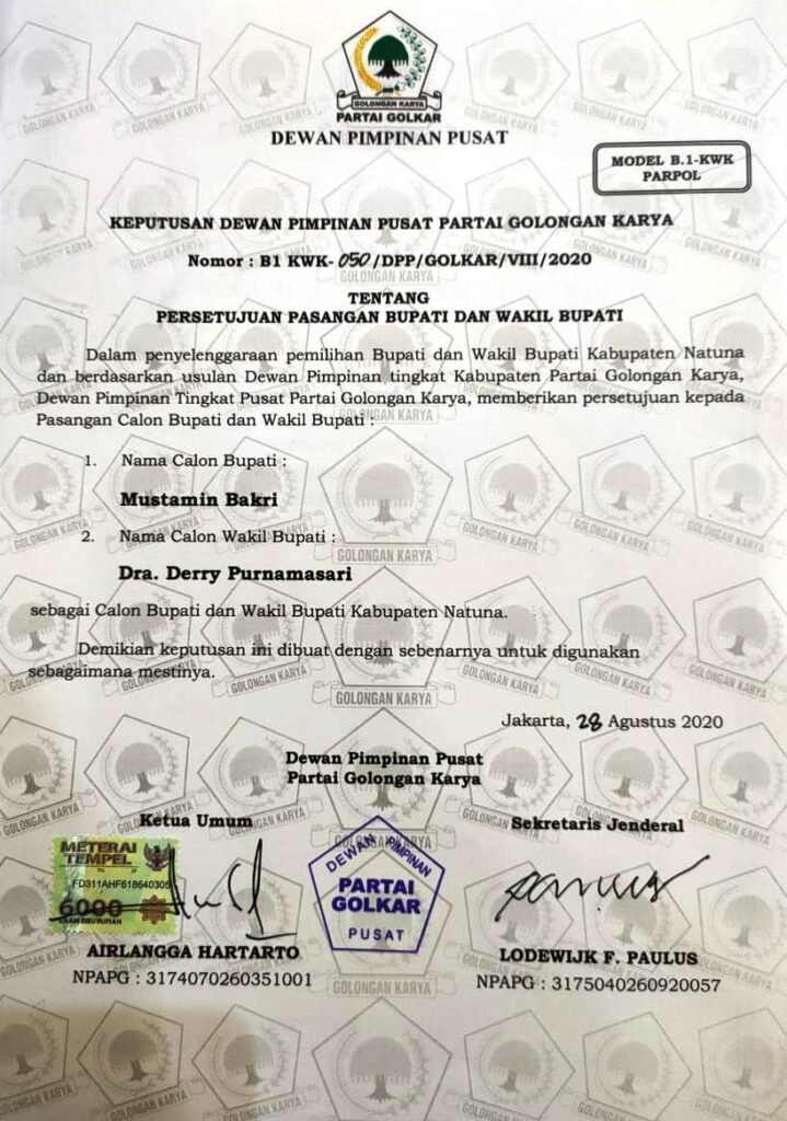 Surat resmi dukungan DPP Golkar dan DPP PAN sudah dipublish ke public, dengan demikian pada pilkada Natuna 2020 dipastikan diikuti oleh 2 pasangan calon saja,