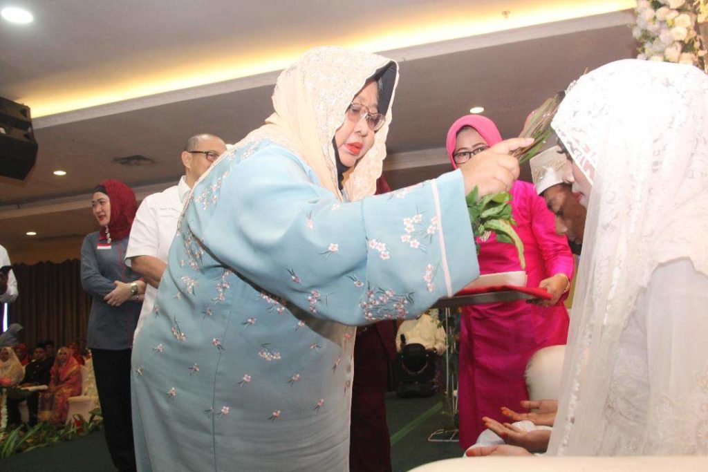 Ketua Umum Lembaga Koordinasi Kesejahteraan Sosial (LKKS) Kepri, Hj Noor Lizah Nurdin melakukan tepung tawar kepada para pengantin dalam nikah massal.