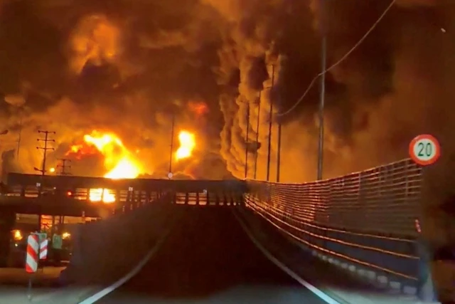 Rekaman video yang beredar memperlihatkan kebakaran di sebuah lokasi penyimpanan minyak di dekat kilang, dengan asap hitam mengepul tinggi ke udara.