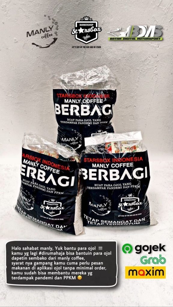 “Yuk bantu para ojol ojol, kamu yang lagi dirumah aja bisa bantuin para ojol dapatin sembako dari Manly Coffee. Syaratnya gampang, kamu cuma perlu pesan makanan di aplikasi ojol tanpa minimal order, kamu sudah bisa bantu membantu mereka yang terdampak masa Pandemi dan PPKM dengan 1 paket sembako berupa 3 Kg beras, 5 bungkus mie instan dan 1 kaleng sarden.