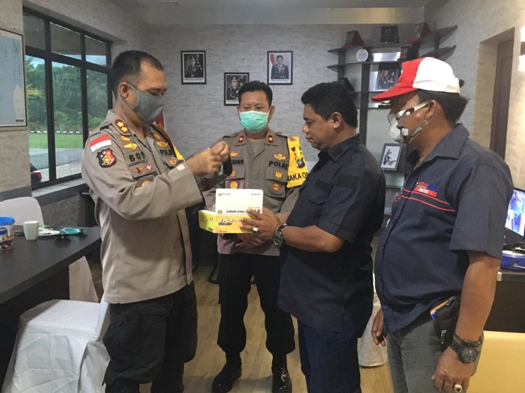 Penyerahan bantuan APD kepada jurnalis diserahkan secara langsung oleh Kapolres Lingga, AKBP Boy Herlambang yang didampinggi Wakapolres Lingga Kompol, M Tahang dan Kasat Reskrim Polres Lingga, AKP Rangga Primazada di Mapolres Lingga, Kamis (23/4/2020).